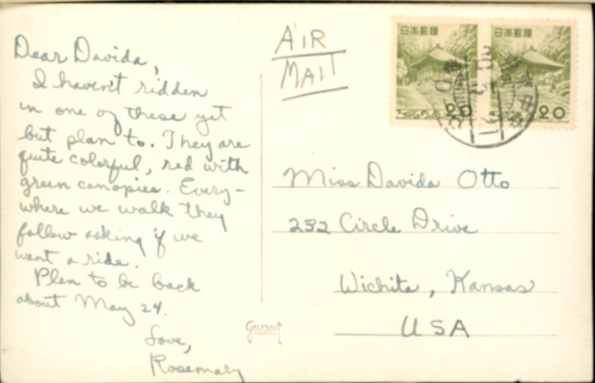 Handwritten label on back says "Dear Davida, I haven't ridden in one of these yet but plan to. They are quite colorful, red with green canopies. Everywhere we walk they follow asking if we want a ride. Plan to be back about May 24. Love, Rosemary Sent to Miss Davida Otto, 232 Circle Drive, Wichita, Kansas USA" - Creator