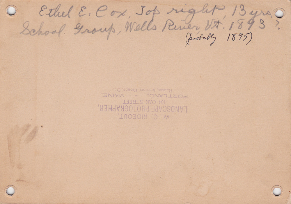 Handwritten label on back says "Ethel E. Cox, Top right, 13 yrs. School group, Wells River, Vt. 1893? (probably 1895)"