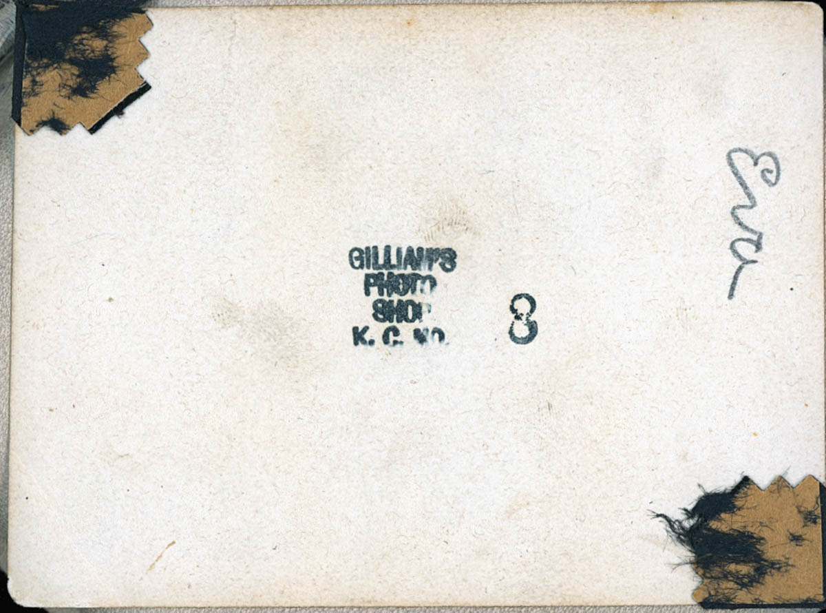 - Snapshot of a child sitting at a table. Handwritten label on back says "Eva." Developer stamp on back says "Gillian's Photo Shop K.C. Mo."
