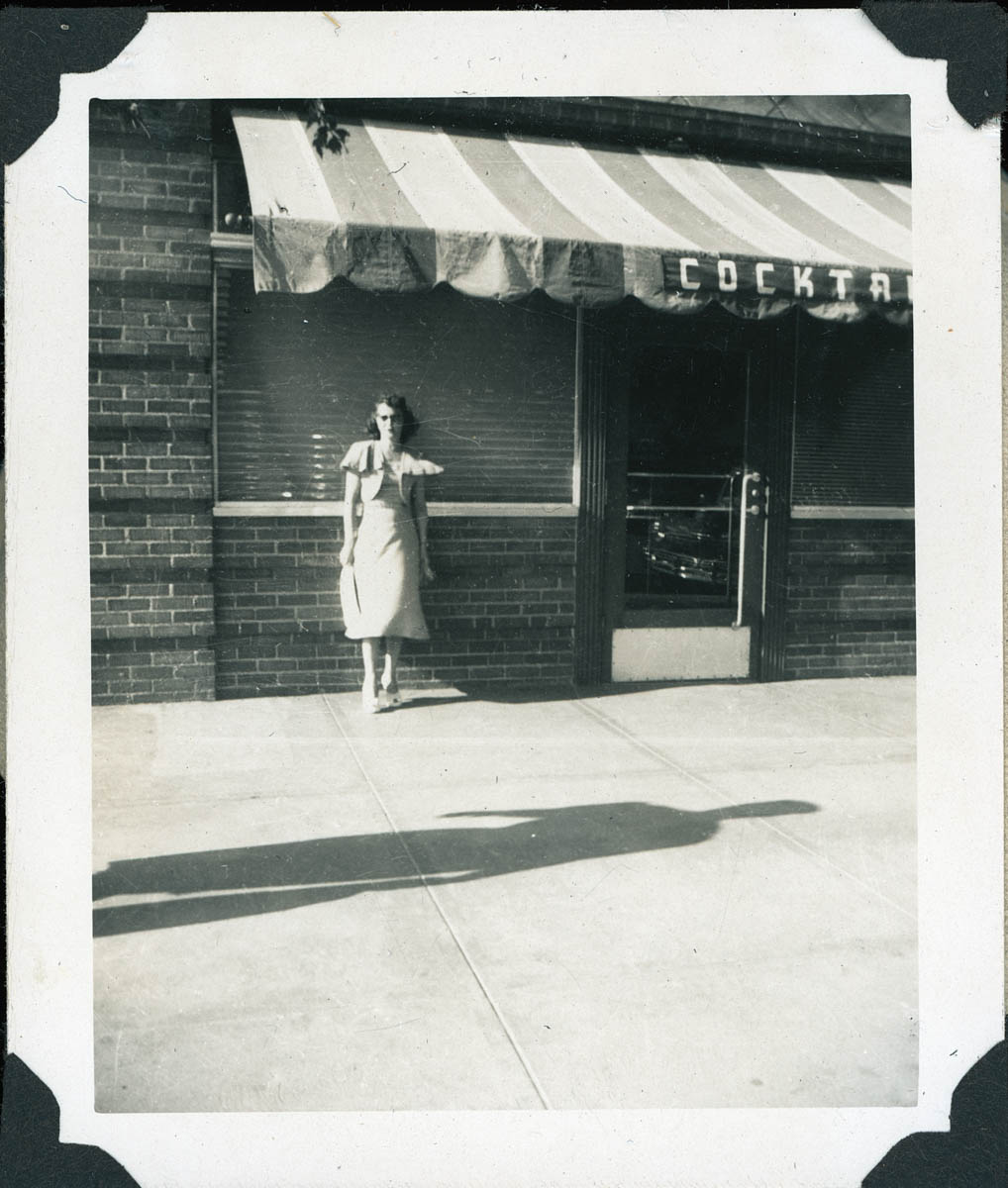 - Snapshot of a woman standing in front of a restaurant.