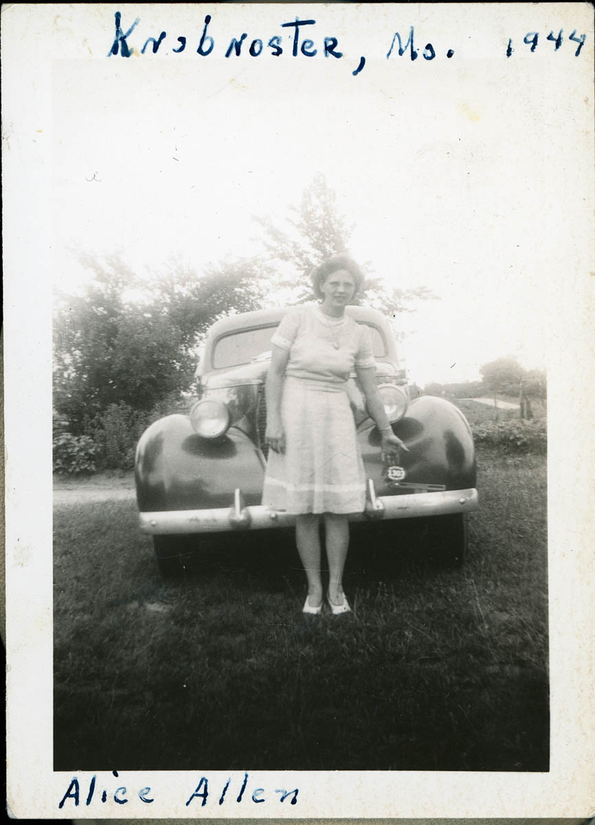 - Snapshot of a woman leaning on a car. Handwritten label on front says "Knobnoster, Mo. 1944 Alice Allen"