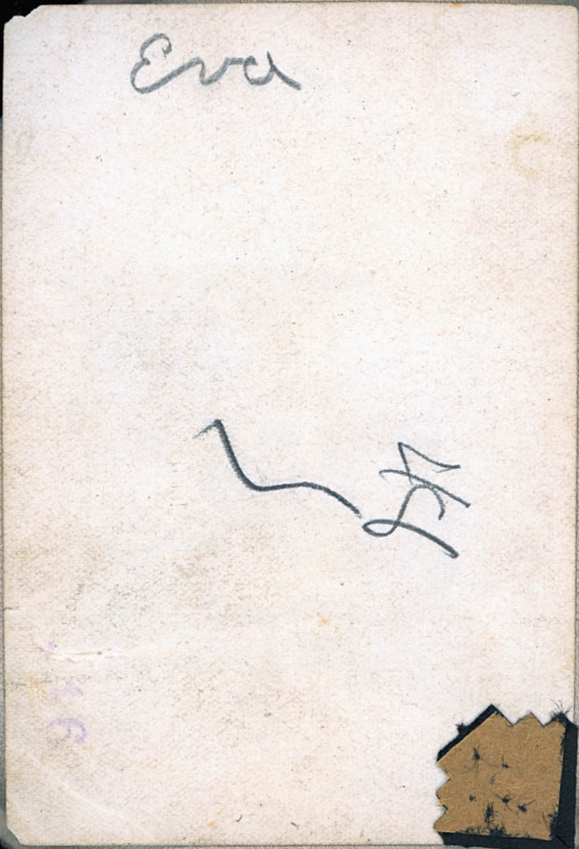 - Snapshot of a child and a dog sitting on the hood of a car. Handwritten label on back says "Eva."