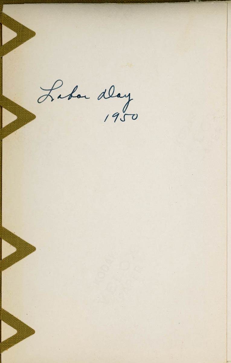 - Snapshot of five adults and two children sitting on a picnic table. Handwritten label on back says "Labor Day, 1950"