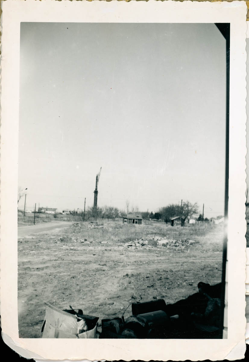 - Snaphot of the pillars of a water tower under construction, taken from near Gentry and 16th streets. Handwritten label on back says "Fall 1950"