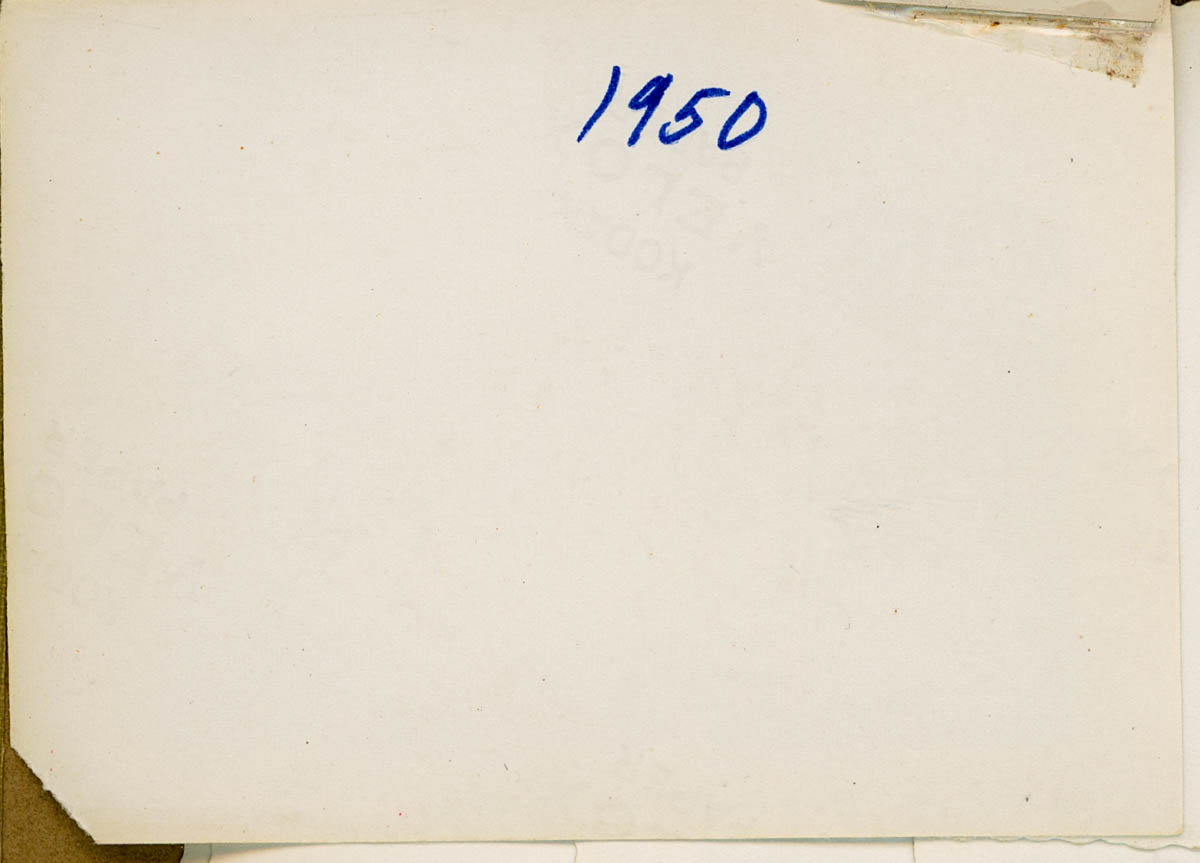 - Snapshot of two men standing in front of a house under construction. Handwritten label on back says "Fall 1950"
