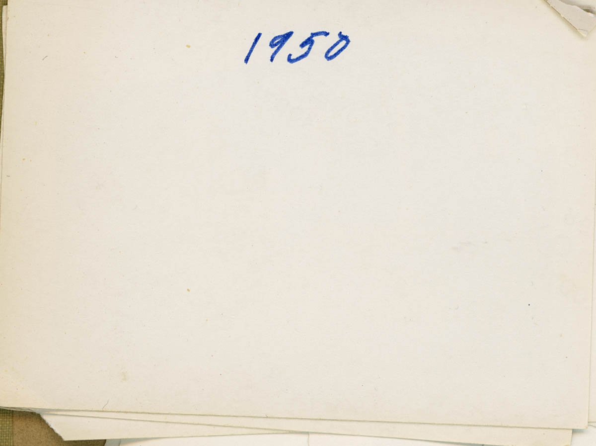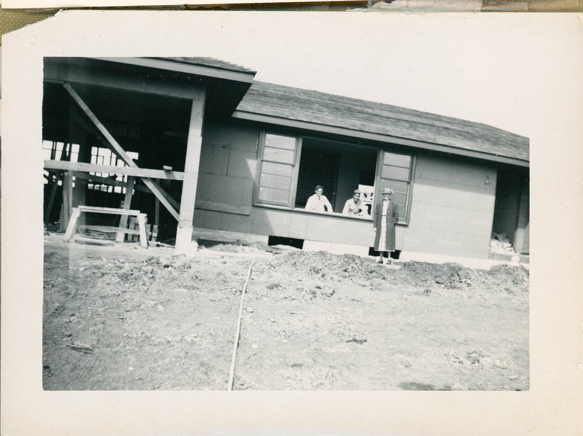 - Snapshot of three people standing in front of a house under construction. Handwritten label on back says "1950"