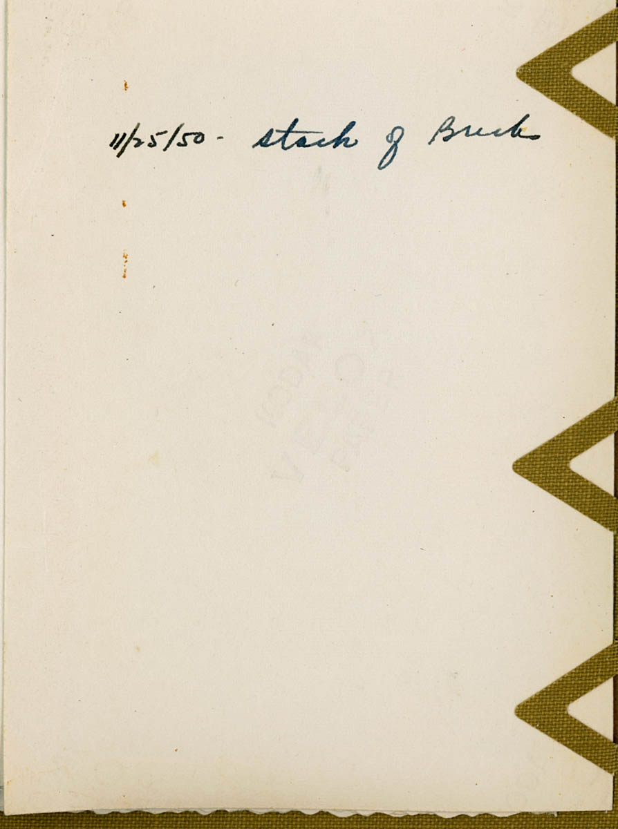- Snapshot of a house under construction. Handwritten label on back says "11/25/1950 -- stack of bricks"
