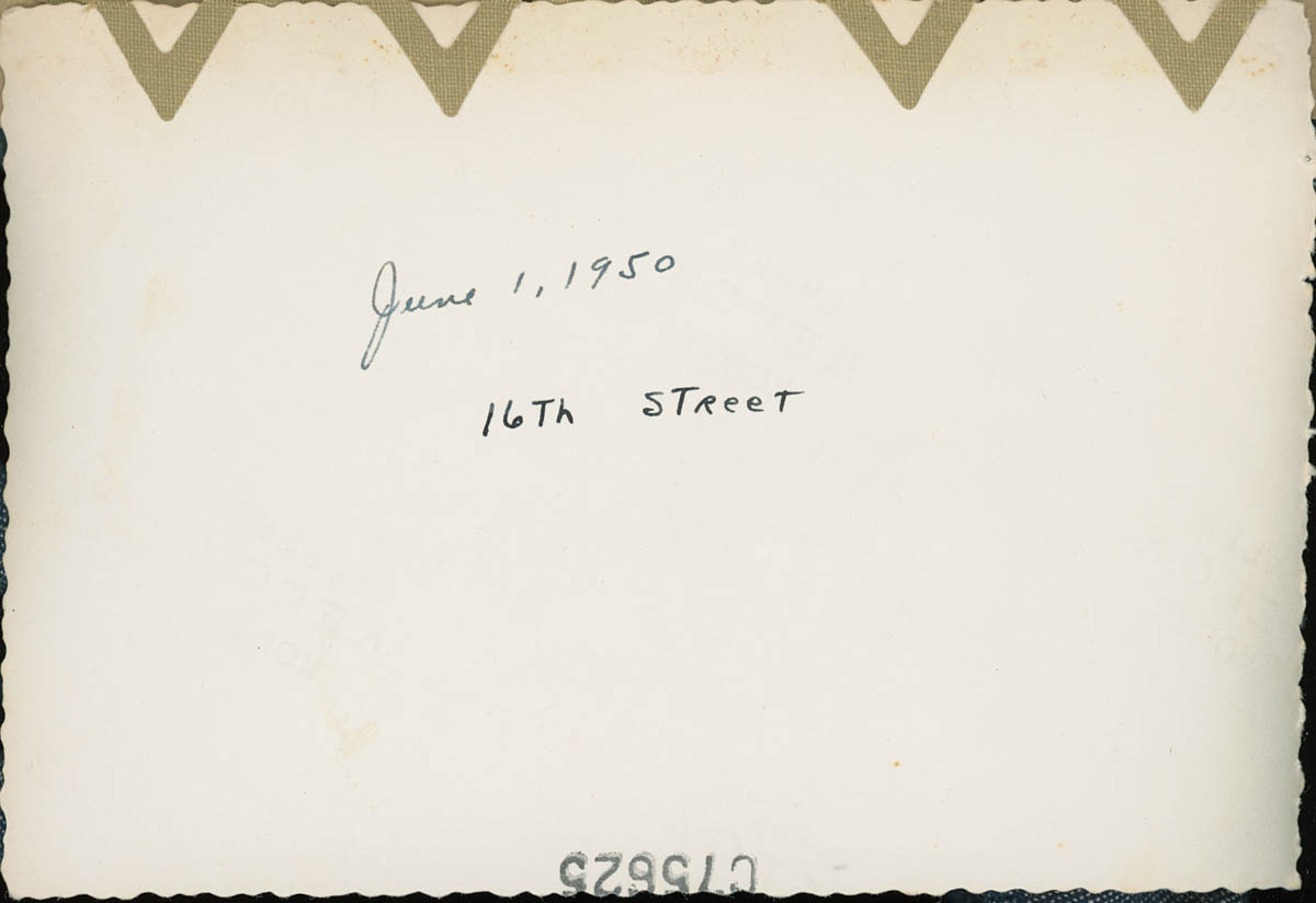 - Snapshot of a woman standing in a lot. Handwritten label on back says "June 1, 1950 16th Street"