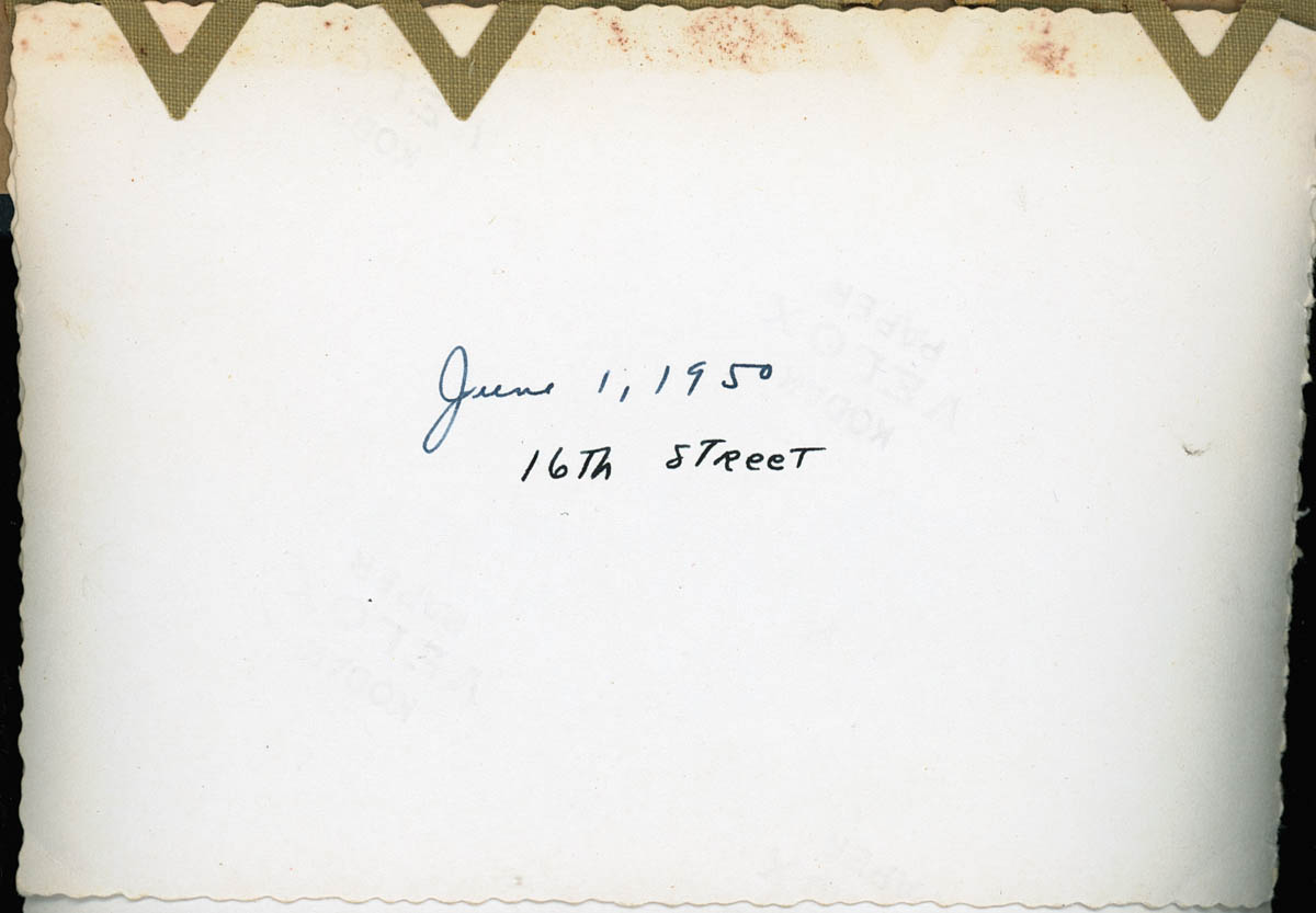 - Snapshot of a woman holding a baby and standing in a lot. Handwritten label on back says "June 1, 1950 16th Street"