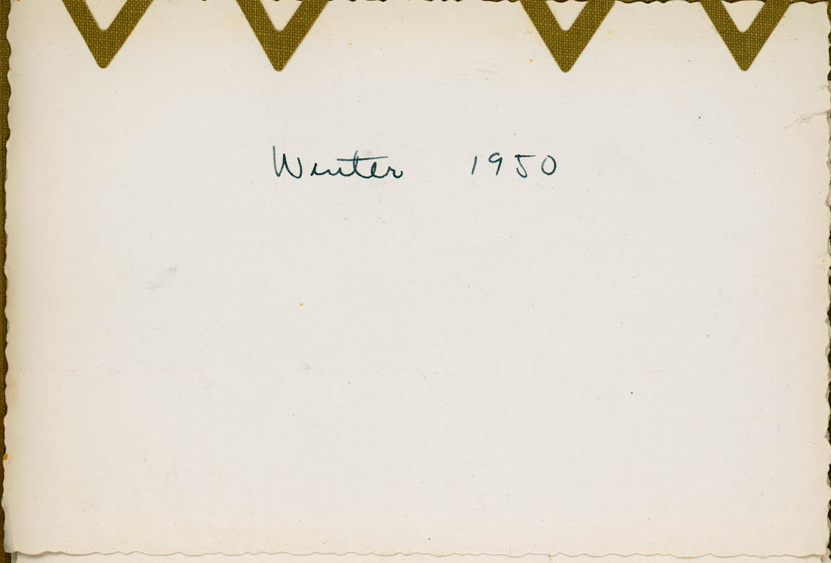 - Snapshot of snow on a house under construction. Handwritten label on back says "Winter 1950"