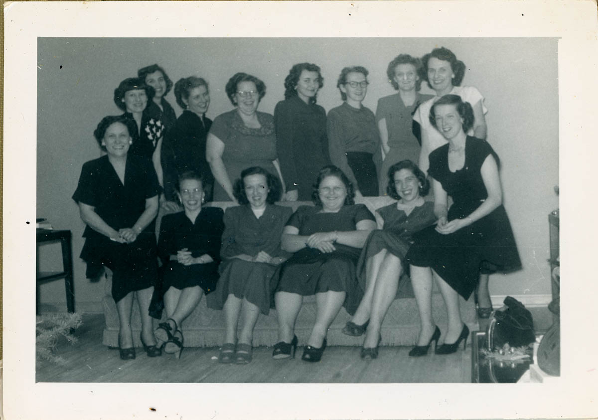 - Snapshot of fourteen women sitting on a sofa. Handwritten label on back says "First Christmas Party of Gamma Chapter Xi Delta Pi Sorority 12/11/50"