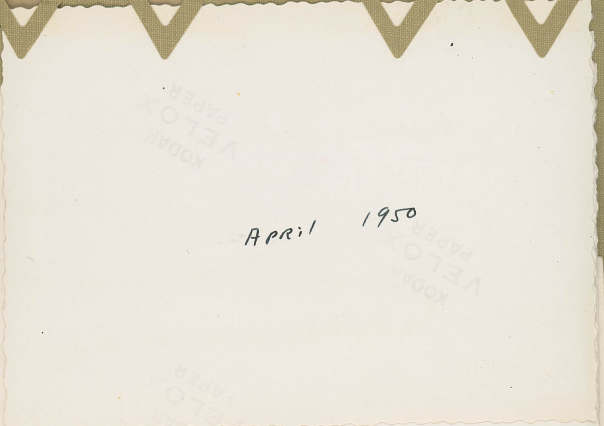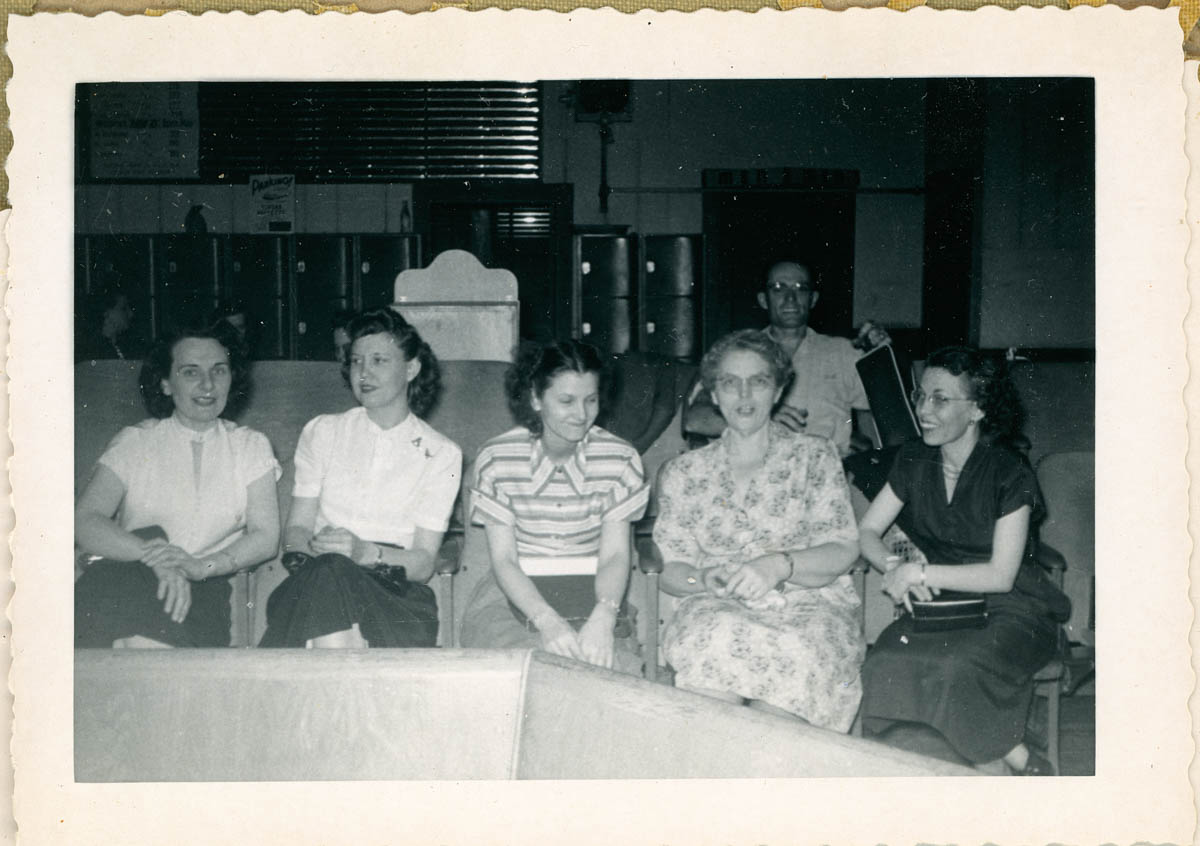 - Snapshot of five women and a man in a bowling alley. Handwritten label on back says "April 1950"