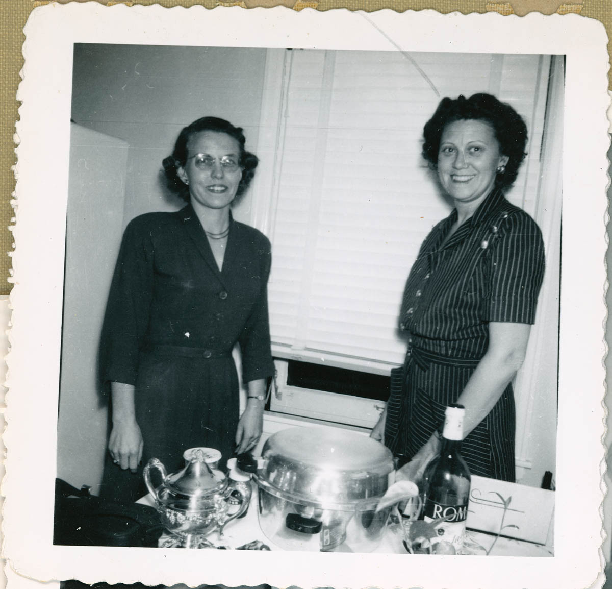 - Snapshot of two women standing at a table. Handwritten label on back says "Oil Secretaries Director's Meeting 12/12/50 at Helen Langston's 1058 N. Terrace Drive Helen Langston and I"