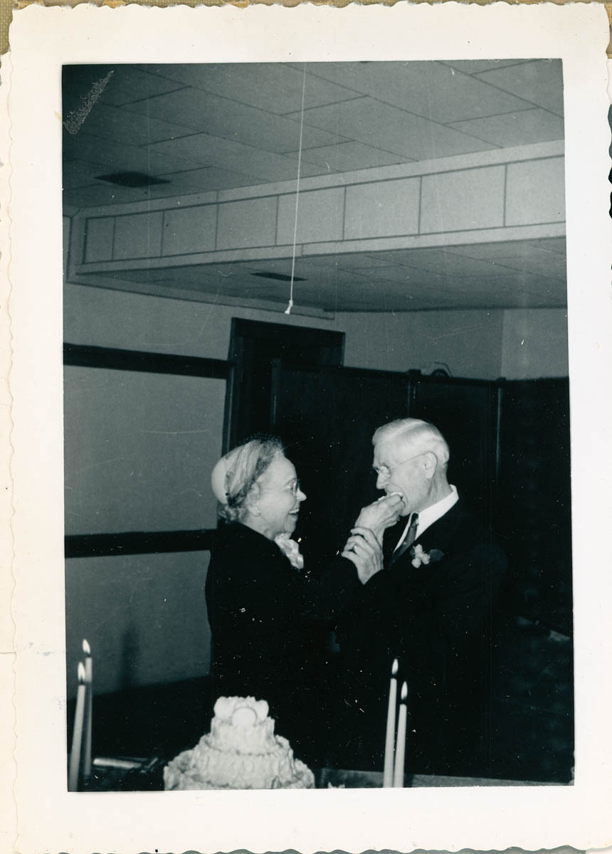 - Snapshot of a man and woman with a cake. Handwritten label on back says "January 1951"