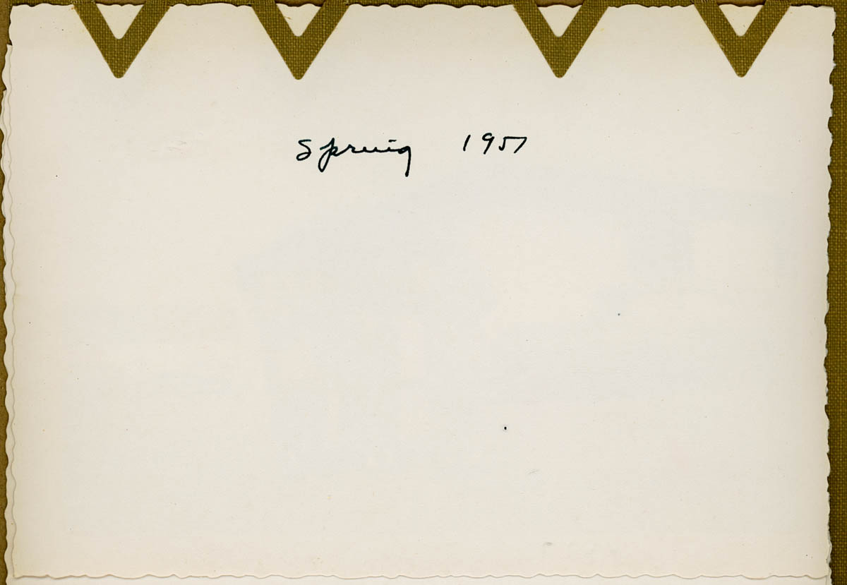 - Snapshot of three people standing in a parking lot and eating. Handwritten label on back says "Spring 1951"