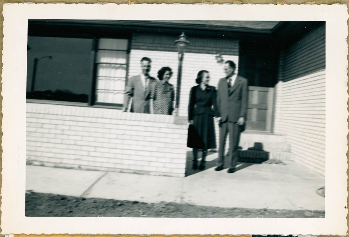 - Snapshot of four people standing in front of a house. Handwritten label on back says "Spring 1951"