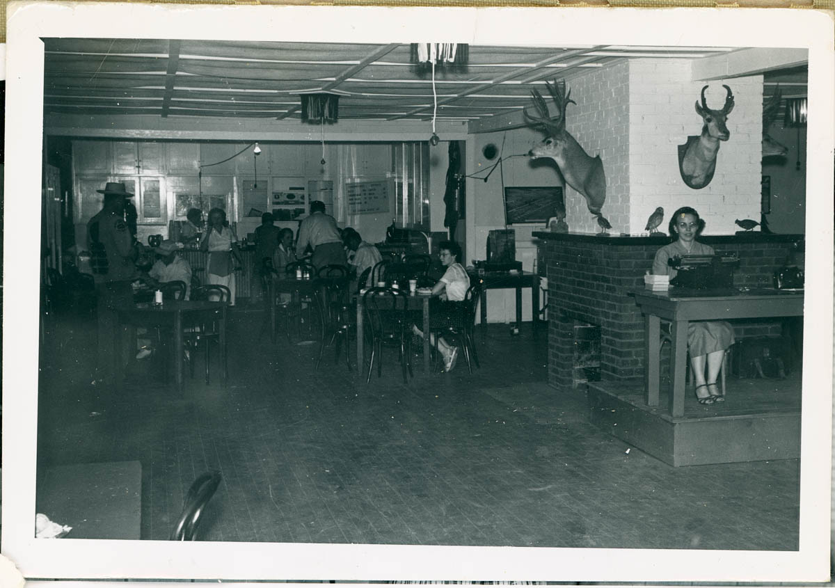 - Snapshot of people in a snack bar; there is a woman sitting behind a typewriter. Handwritten label on back says "Aug. 1952"