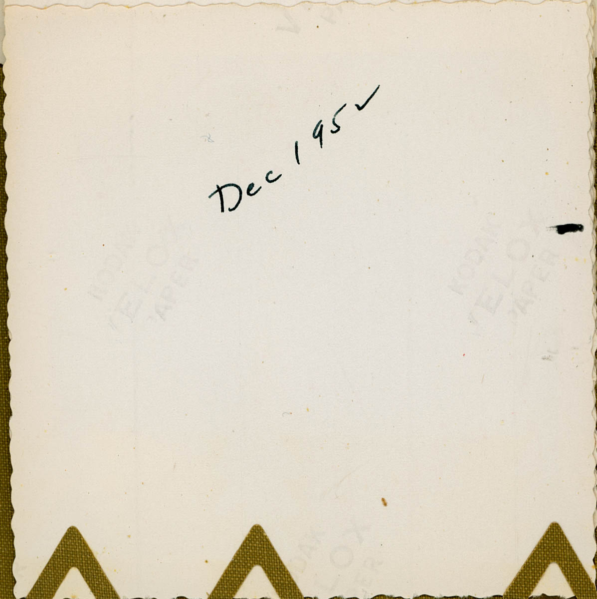 - Snapshot of three women in formal dress posed around a sofa. Handwritten label on back says "Dec. 1952"