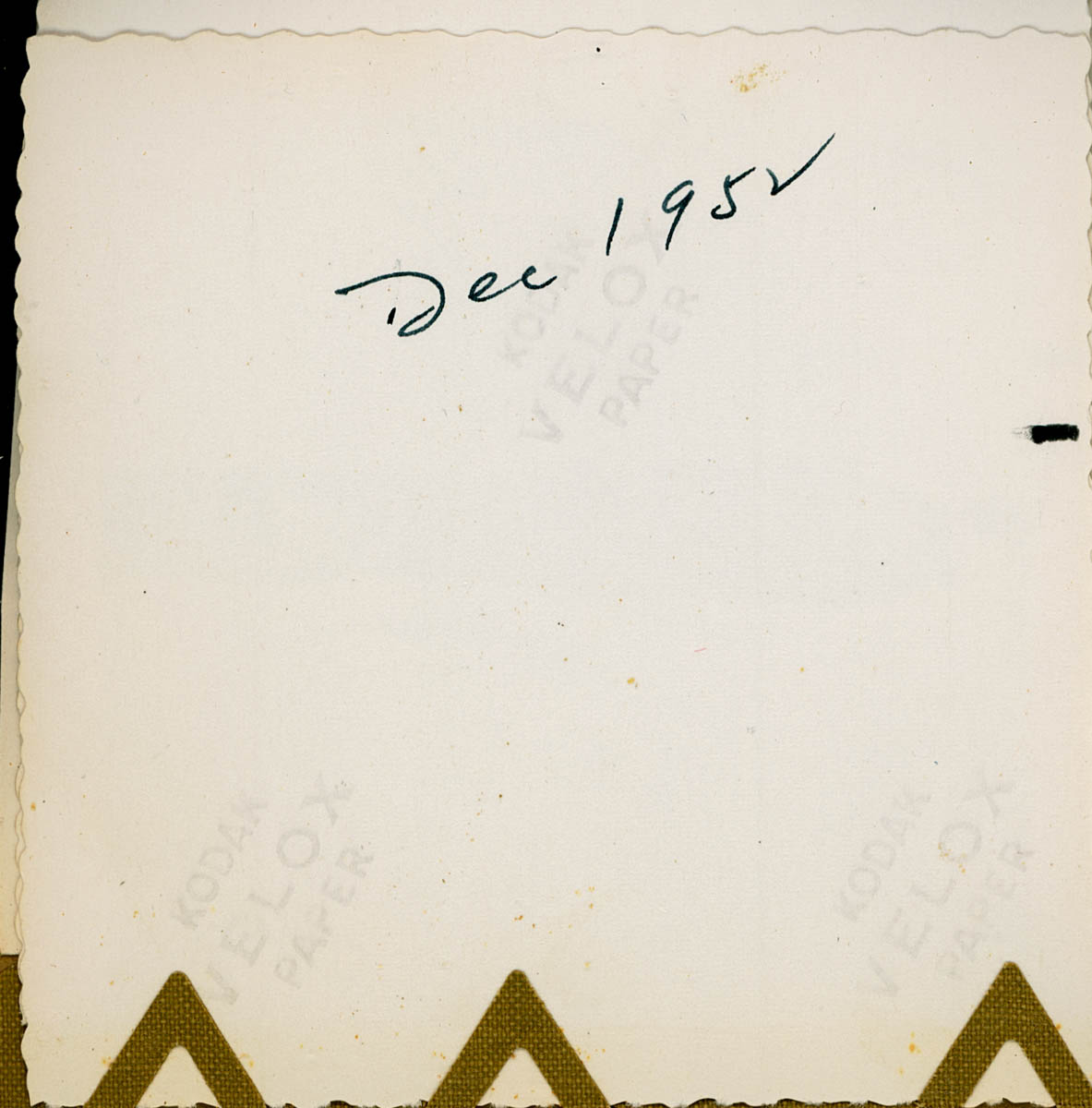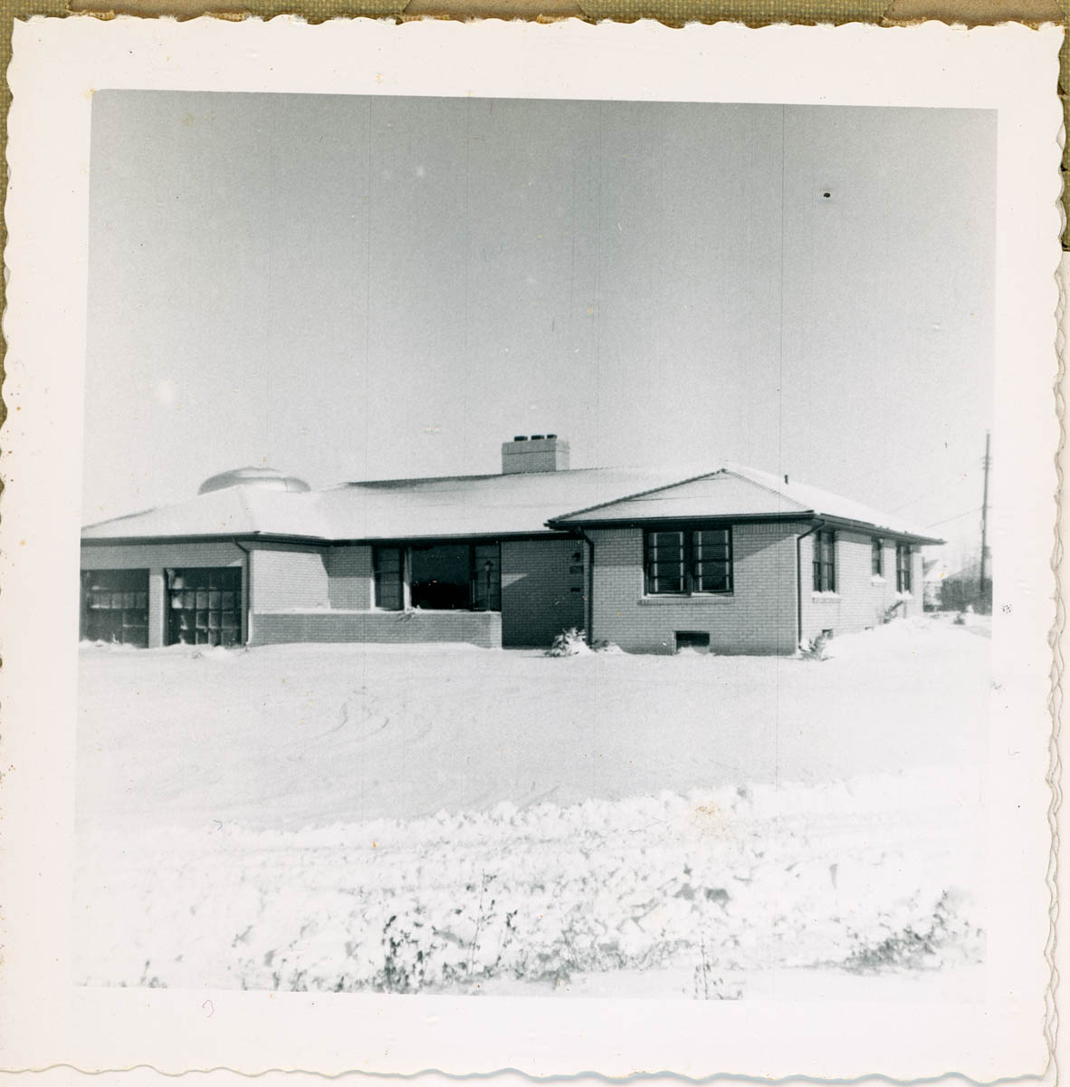 - Snapshot of a house in the snow. Handwritten label on back says "Dec. 1952"