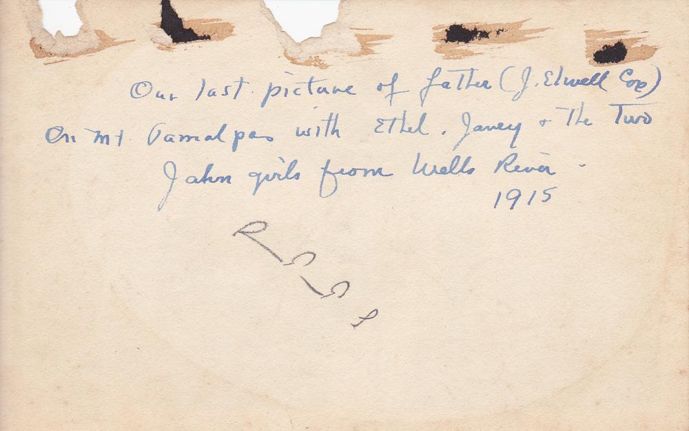 Handwritten label on back says "Our last picture of father (J. Elwell Cox) on Mt. Tamalpas[sic] with Ethel, Janey & the two Jahn girls from Wells River. 1915" - Date
