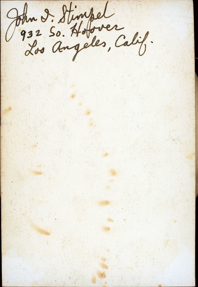 - Portrait of a man in Navy uniform. Handwritten label on back says "John I. Stimpel, 932 So. Hoover, Los Angeles, Calif."