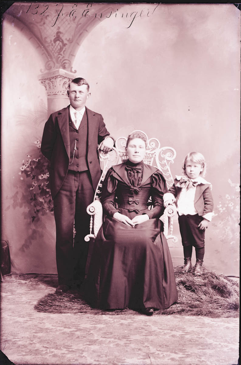 - Studio portrait of a man, woman and boy. Handwritten label on plate says "132 J. E. Ensinger" Found in Box A, labeled "Oxford"