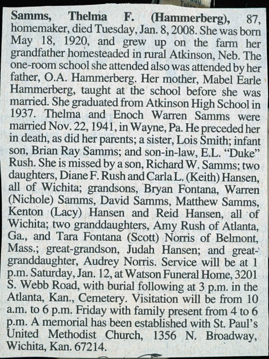 Wichita Eagle, “Thelma Samm Obituary,” MHGS Digital Collections, accessed April 30, 2026, https://mhgswichita.org/om/items/show/10610.