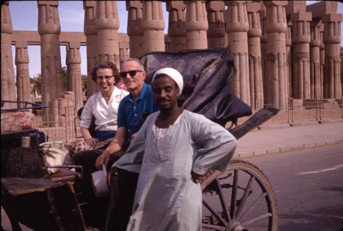 - Snapshot of two people sitting in a a wagon with a driver. Handwritten label on slide says "Buggy Ride Luxor - Egypt"
