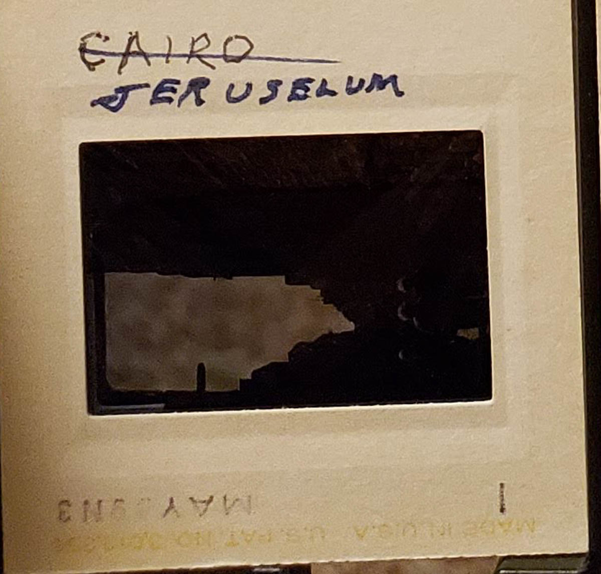 - Snapshot of people walking along a narrow street with stone walls. Handwritten label on slide says "Jerusalum[sic]"