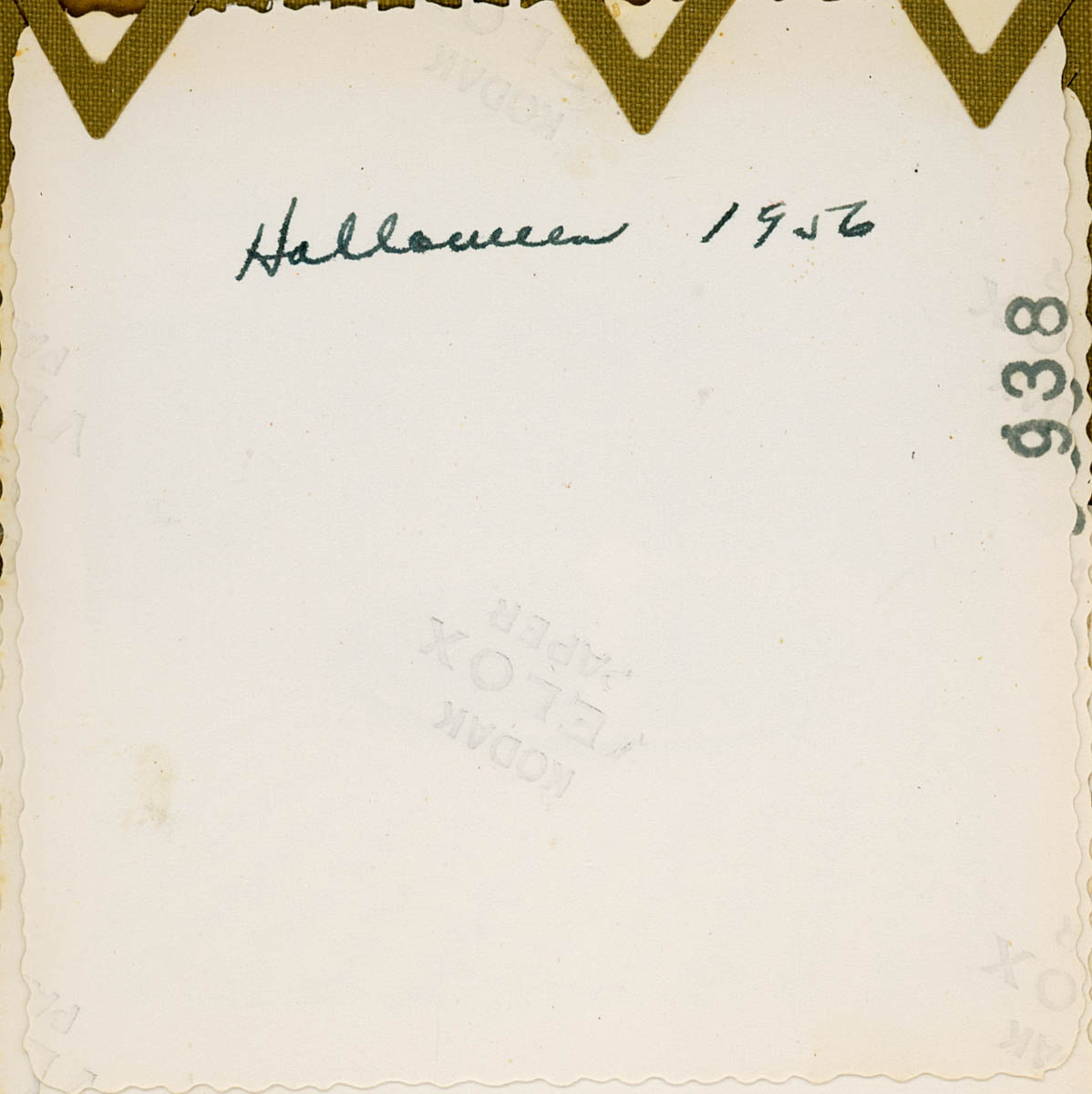 - Snapshot of a plate on a table. Handwritten label on back says "Halloween 1956"