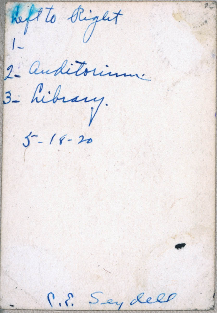 - Snapshot of two limestone buildings on a college campus. Handwritten label on front says "East side of Auditorium and Library" and on back "Left to Right 1 - 2 - Auditorium 3 - Library 5-18-20 C. E. Seydell"