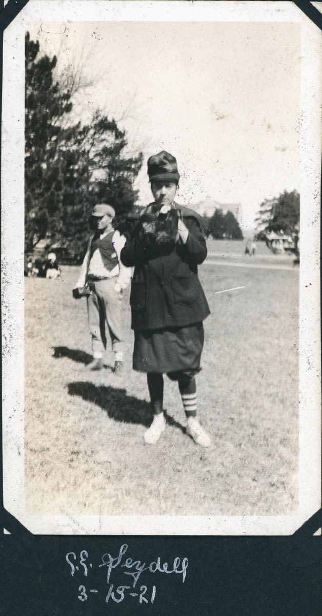 - Snapshot of students in costume. Handwritten label says "C.E. Seydell 3-15-1921"