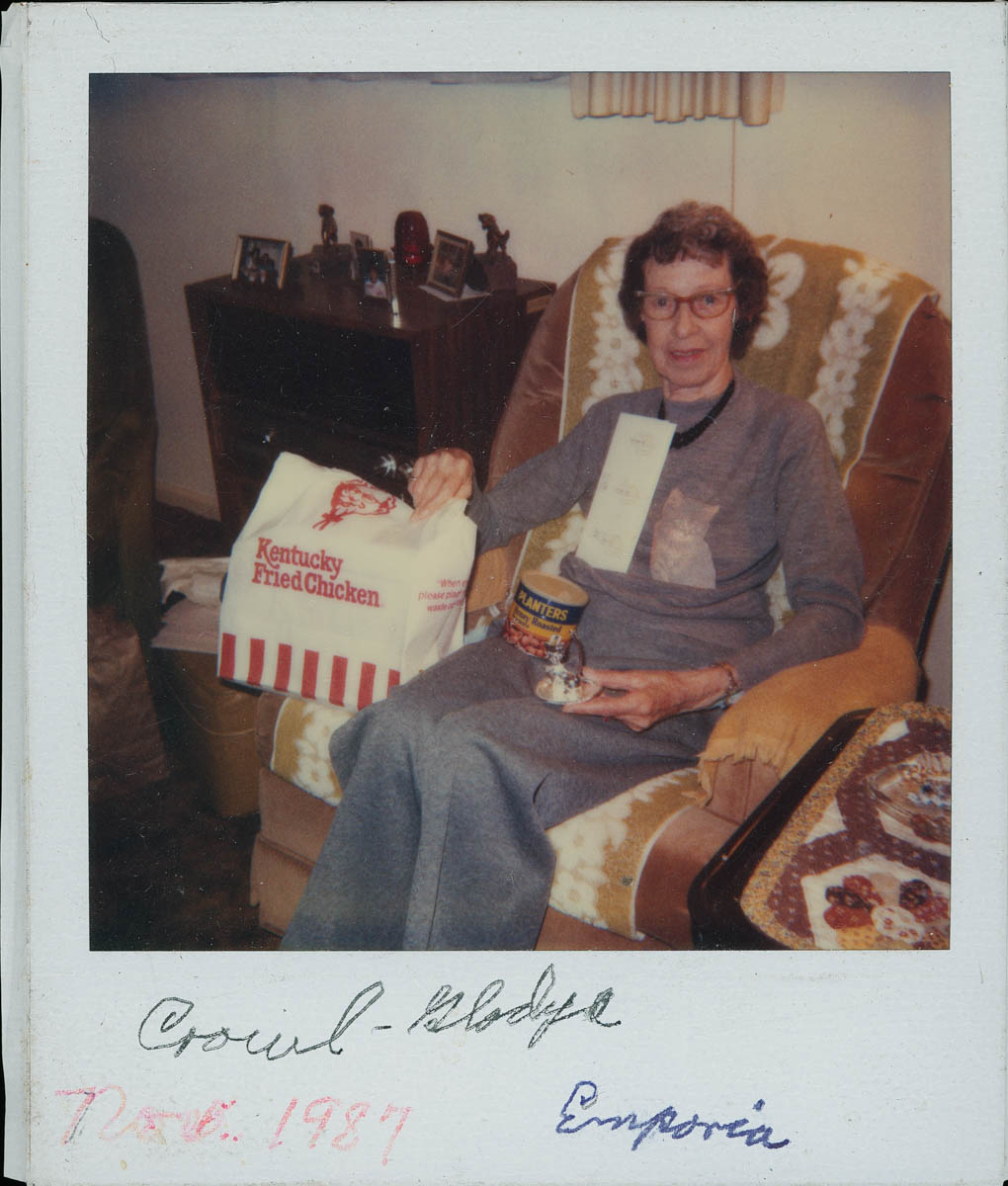 - Snapshot of a woman sitting in a chair. Handwritten label on frame says "Crowl - Gladys Nov. 1987 Emporia"