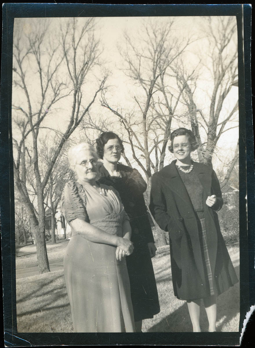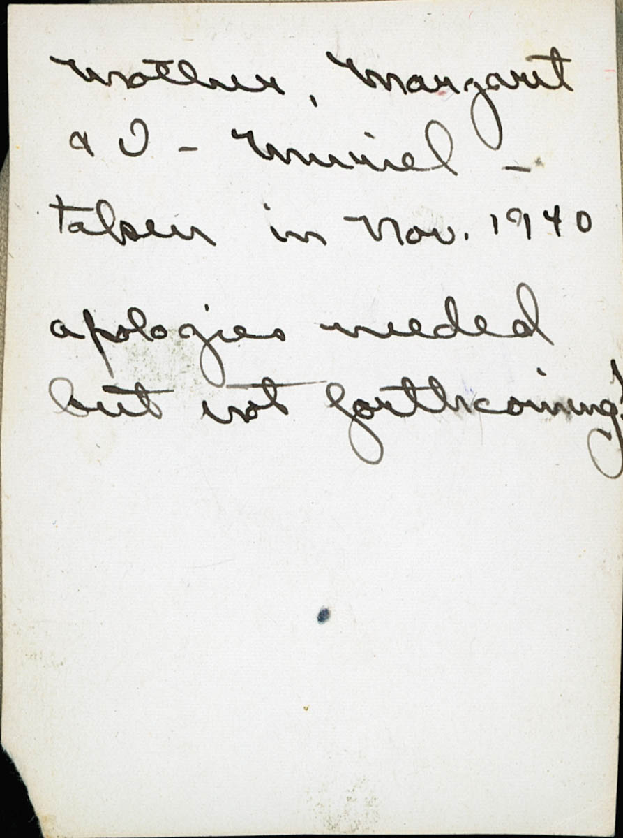 - Snapshot of three women. Handwritten label on back says "Mother, Margaret and I - Muriel - taken in Nov. 1940. Apologies needed but not forthcoming!"