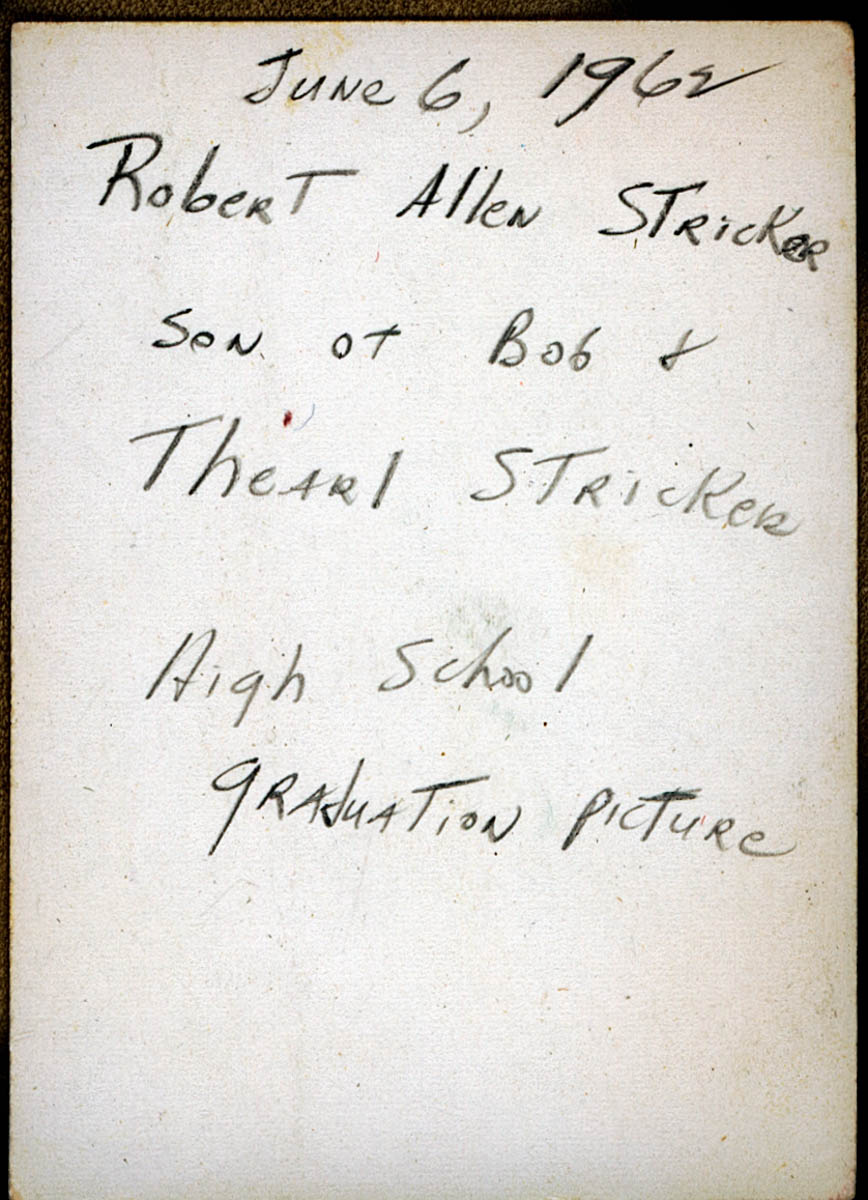 - Portrait of a young man. Handwritten label on back says "June 6, 1962 Robert Allen Stricker son of Bob & Thearl Stricker High School Graduation Picture"