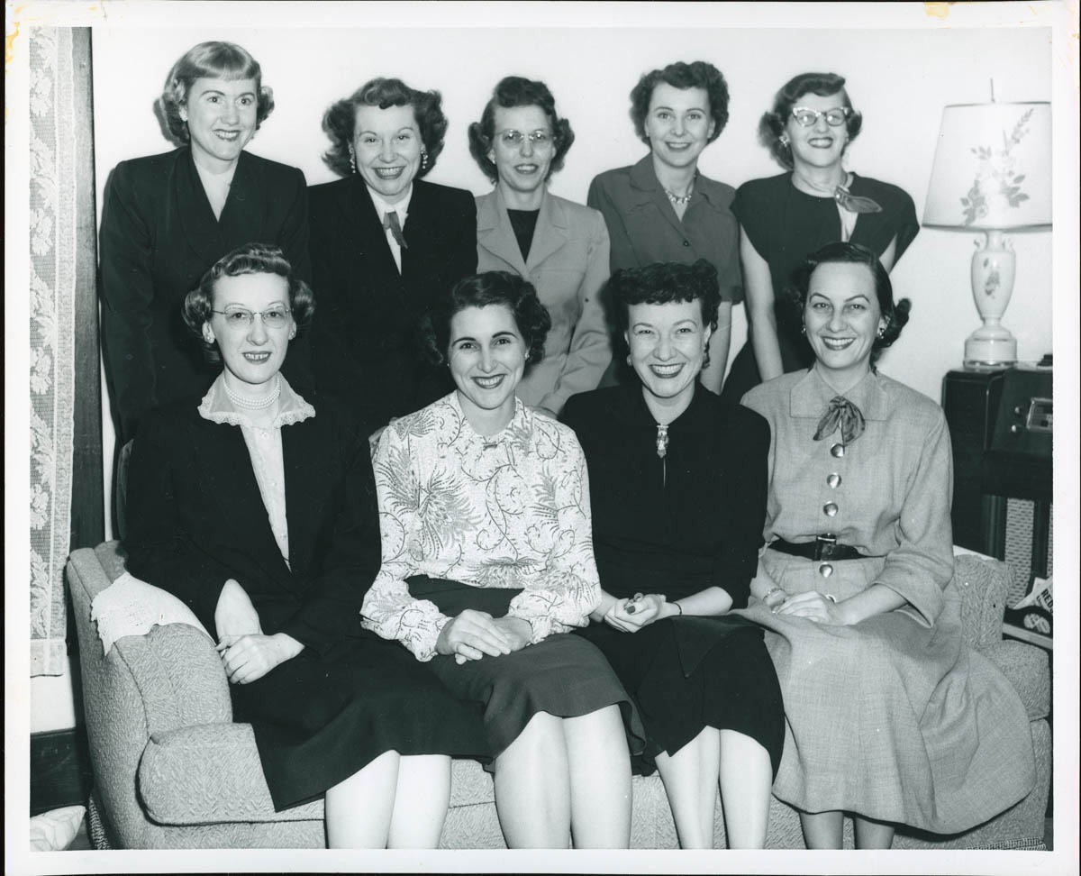 - Snapshot of nine women posing around a sofa. Handwritten label on back says "1951"