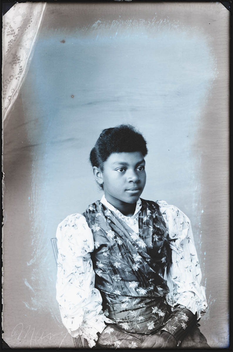 - Studio portrait of a young woman. Handwritten label on plate says "Mary Campbell" Found in Box I, labeled "Pan Handle." Because of our scanning procedure, this image is most likely flipped horizontally.