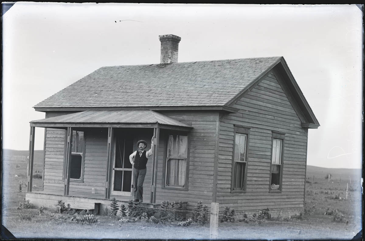 - Portrait of a man standing on the porch of a house. Handwritten label on plate says "Ed Montgomery" Found in Box I, labeled "Pan Handle." Because of our scanning procedure, this image is most likely flipped horizontally.