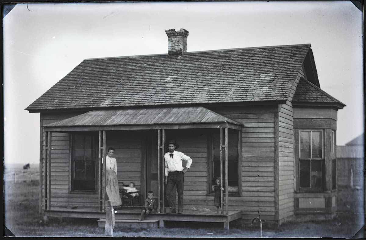 - Portrait of a man, woman and three children on the porch of a house. Handwritten label on plate says "Ed Montgomery" Found in Box I, labeled "Pan Handle." Because of our scanning procedure, this image is most likely flipped horizontally.