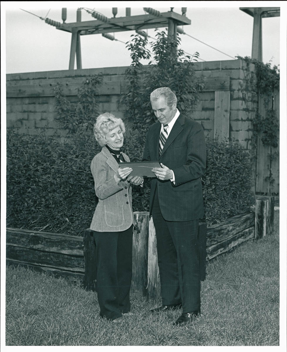 - Snapshot of a man and woman holding a plaque. This photo is part of album MHGS_PB_1968-79.