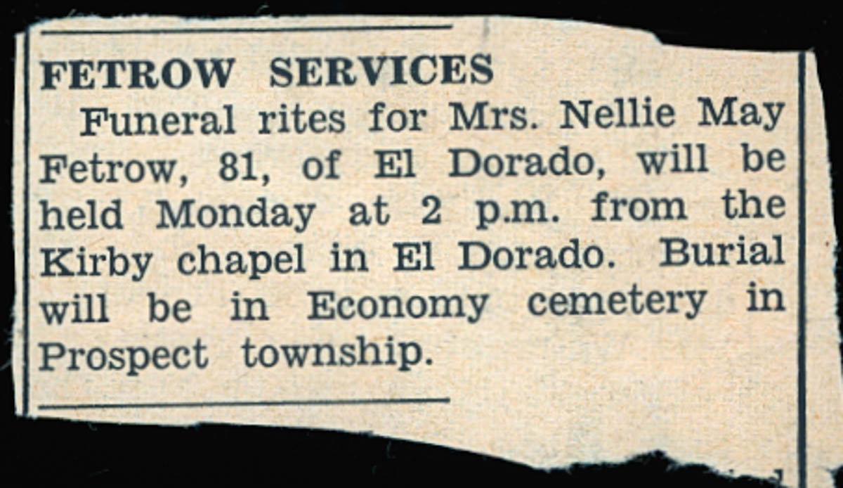Unknown Newspaper, “Obituary for Nellie May Fetrow,” MHGS Digital Collections, accessed April 19, 2026, https://mhgswichita.org/om/items/show/11558.