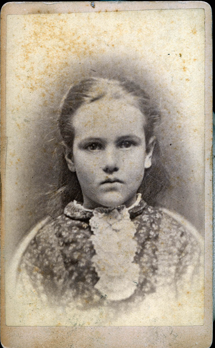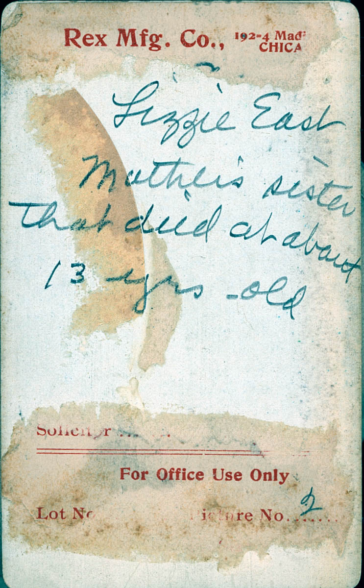 - Portrait of a girl. Handwritten label on back says "Lizzie East Mother's sister that died at about 13 yrs old"