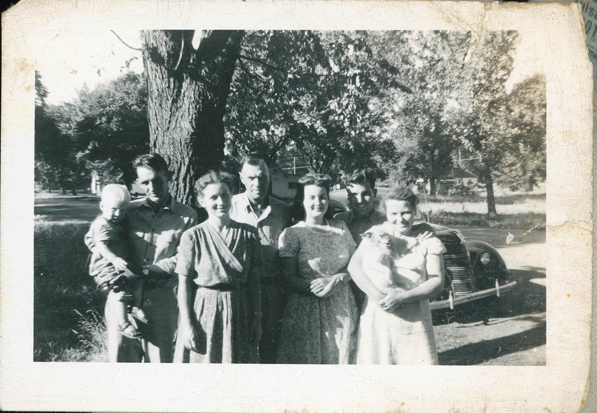 - Snapshot of six adults standing under a tree; one holds a baby, another holds a dog.