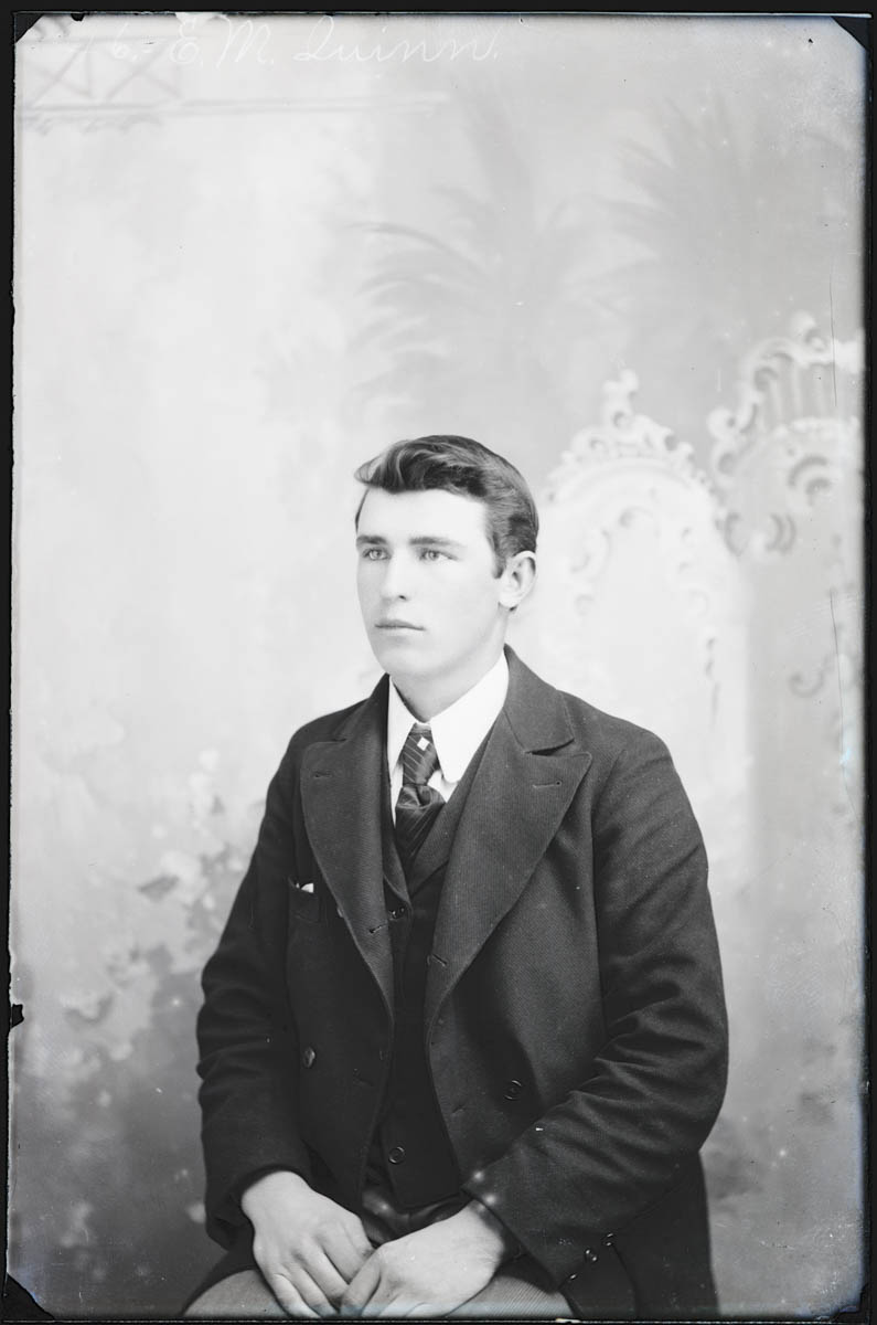 - Studio portrait of a man. Handwritten label on plate says "46 E. M. Quinn" Found in Box K, labeled "Oxford." Because of our scanning procedure, this image is most likely flipped horizontally.