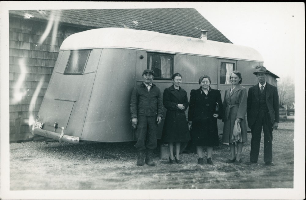 - Snapshot of five people standing in front of a camper. Handwritten label on back says "l-r Will Selzer, Mildred Fortner, Minnie Holgerson & Will and Alice Kerch"
