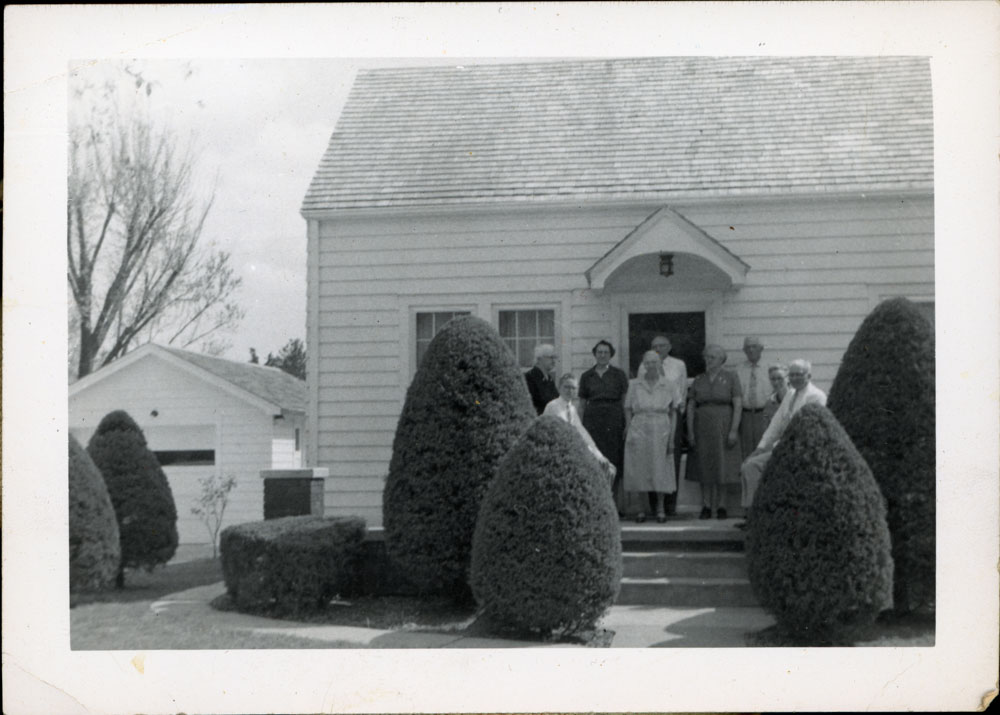 - Snapshot of nine people standing on the front steps of a house. Handwritten label on back says "The Rillings at Fred Rilling's home in Newton."