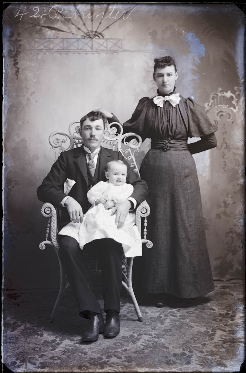 - Studio portrait of a man and woman; the man is holding a baby. Handwritten label on plate says "42 P. Hunter" Found in Box K, labeled "Oxford." Because of our scanning procedure, this image is most likely flipped horizontally.