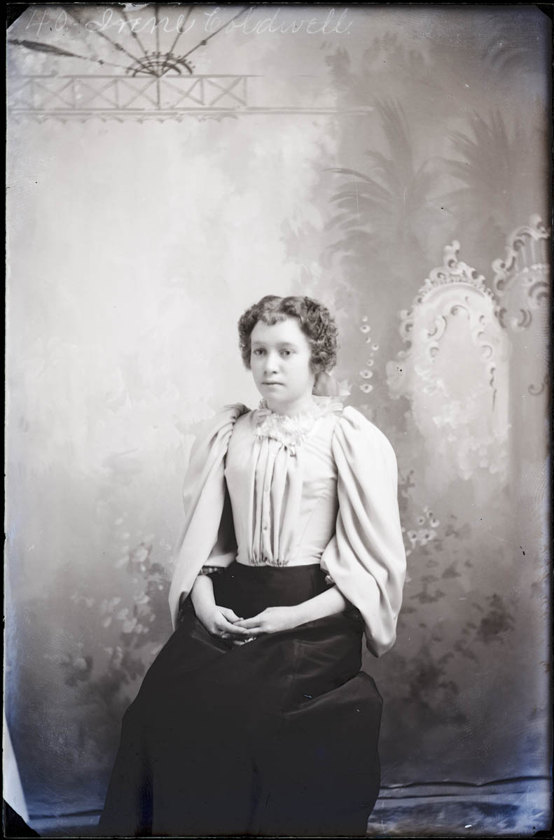 - Studio portrait of a young woman. Handwritten label on plate says "40 Irene Coldwell" Found in Box K, labeled "Oxford." Because of our scanning procedure, this image is most likely flipped horizontally.