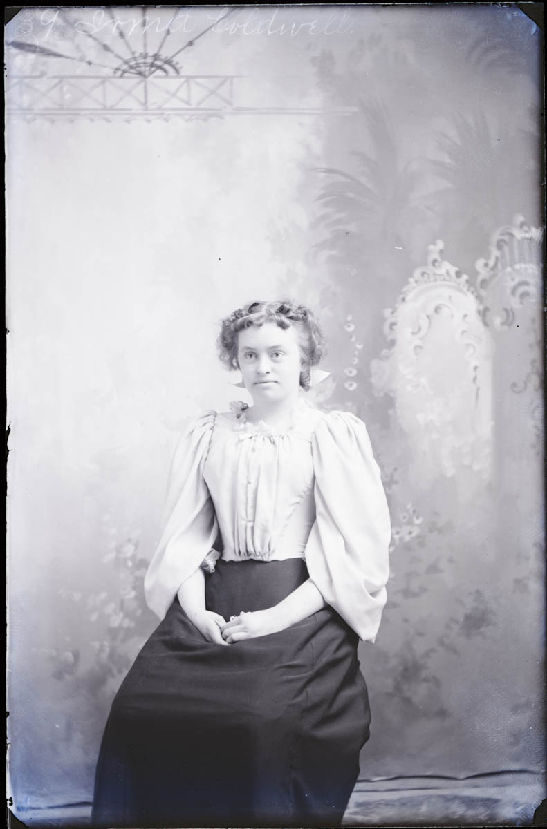 - Studio portrait of a young woman. Handwritten label on plate says "39 Irma Coldwell" Found in Box K, labeled "Oxford." Because of our scanning procedure, this image is most likely flipped horizontally.