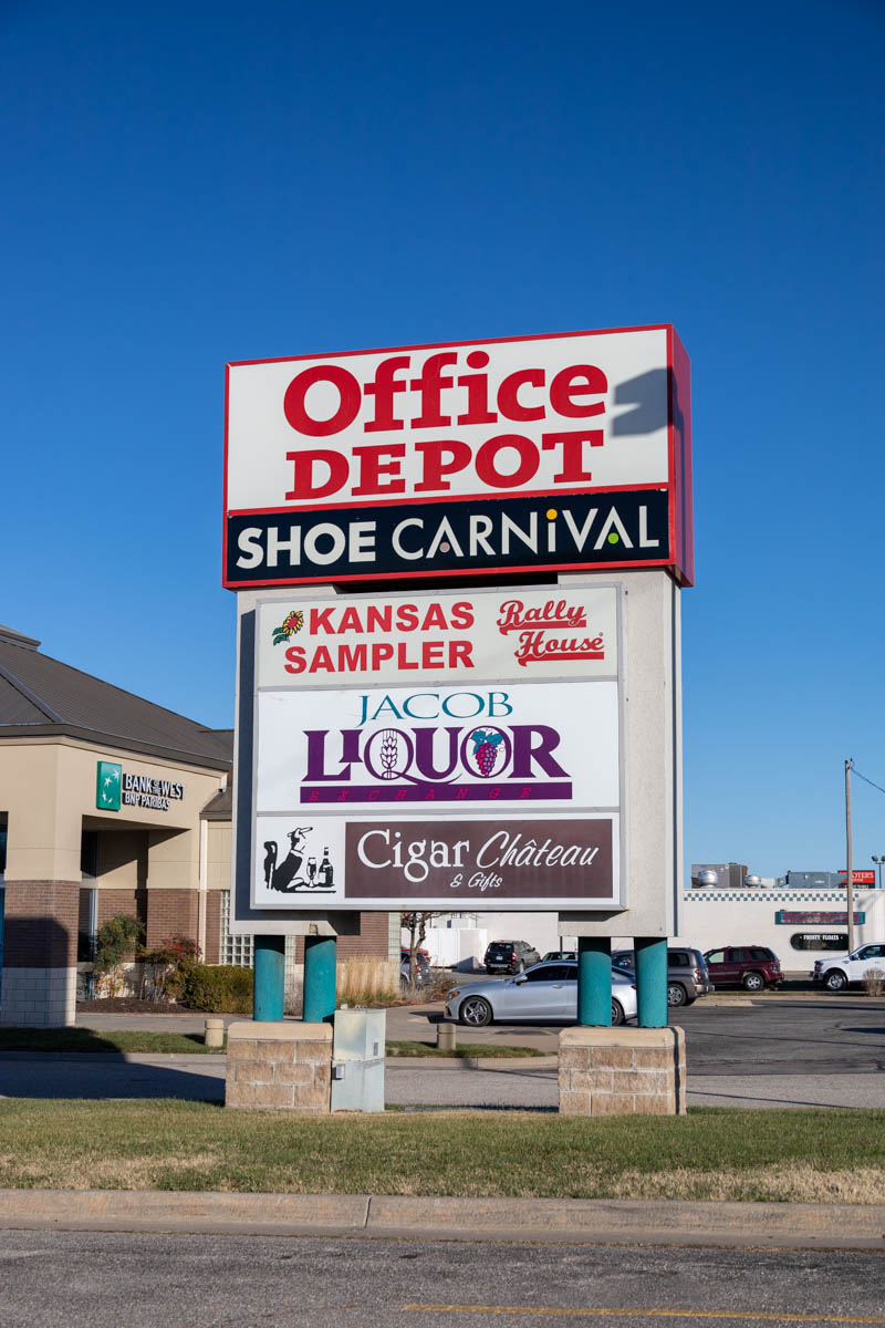 - Sign for Office Depot, Shoe Carnival, Kansas Sampler & Jacob's Liquor Exchange